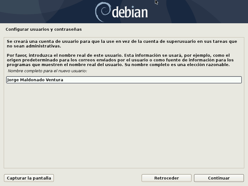 Debian también impone la creación de una cuenta de usuario estándar para que el administrador no adquiera el mal hábito de trabajar como root. La norma básica de precaución significa esencialmente que se realiza cada tarea con los permisos mínimos necesarios para limitar el daño que pueda causar un error humano. Es por esto que el instalador pedirá el nombre completo de su primer usuario, su nombre de usuario y su contraseña (dos veces para evitar el riesgo de entradas erróneas).